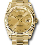 36mm 18K yellow gold case, fluted bezel, champagne dial, Arabic numerals, and President bracelet.