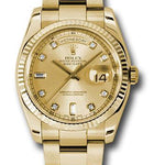 36mm 18K yellow gold case, fluted bezel, champagne dial, 8 round and 2 baguette diamond hour markers, and Oyster bracelet.