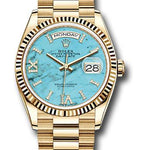 36mm 18K yellow gold case, screw-down back, screw-down crown with twinlock double waterproofness system, fluted bezel, scratch-resistant sapphire crystal with cyclops lens over the date, turquoise dial, diamond-set index and Roman numeral 6 and 9 hour markers, Rolex calibre 3255 perpetual self-winding movement with centre hour, minute and seconds hands, instantaneous day and date in apertures, unrestricted rapid-setting, and stop-seconds for precise time setting, approximately 70 hours of power reserve, 18K yellow gold President bracelet with semi-circular three-piece links, concealed folding Crownclasp buckle. Waterproof to 100 meters. Baselworld 2019 release.