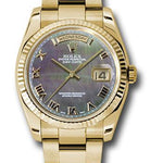 36mm 18K yellow gold case, fluted bezel, dark mother of pearl dial, Roman numerals, and Oyster bracelet.