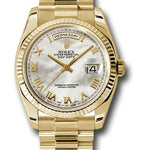 36mm 18K yellow gold case, fluted bezel, mother of pearl dial, Roman numerals, and President bracelet.