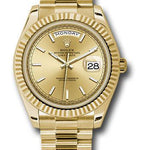 40mm 18K yellow gold case, screw-down back with Rolex fluting, screw-down crown with twinlock double waterproofness system, fluted bezel, scratch-resistant double anti-reflective sapphire crystal with cyclops lens over the date, champagne dial, index hour markers with Chromalight, Rolex calibre 3255 automatic movement with centre hour, minute and seconds hands, instantaneous day and date in apertures, unrestricted rapid-setting, and stop-seconds for precise time setting, approximately 70 hours of power reserve, President bracelet with three-piece solid links comprised of a polished center link, satin-finished outer links, and ceramic inserts, concealed folding Crownclasp buckle. Waterproof to 100 meters.