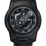 45mm black PVD treated titanium and steel case, transparent back, sapphire crystal, black dial with silver gear-train bridge, Caliber UN-205 manual-winding movement with hour and minutes indicated by the rotation of the movement, winding by rotating the back bezel, and time set with the front bezel, approximately 7 days of power reserve, black sailcloth strap with red bar tack loop stitches, folding buckle. Water resistant to 30m.