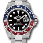 40mm stainless steel case with Oystersteel monobloc middle case, screw-down crown, bidirectional rotatable 24-hour graduated bezel with red and blue Cerachrom insert and engraved numerals, scratch-resistant sapphire crystal with cyclops lens over the date, black dial, hour markers set with Chromalight, Rolex calibre 3285 self-winding movement with second time-zone hour hand and instantaneous date, approximately 70 hours of power reserve, stainless steel Oyster bracelet with flat three-piece links, folding Oysterlock buckle with Easylink 5mm comfort extension link. Waterproof to 100 meters.