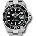 40mm stainless steel case, bidirectional rotatable bezel with 24-hour engraved black Cerachrom insert, green 24 hour second time zone hand, independent 12 hour hand, black dial, and stainless steel Oyster Fliplock bracelet with Easylink 5 mm comfort extension link. Water resistant to 100 meters.