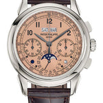 41 mm platinum case, 12.4 mm thick, interchangeable full back and sapphire-crystal back, golden opaline dial with blackened gold applied numerals, caliber CH 29-535 PS Q manually wound movement with day, month, leap year and day/night display in apertures, date by hand, seconds subdial, tachymeter scale, approximately 55-65 hours of power reserve, shiny chocolate brown alligator strap with square scales, fold-over buckle. Water resistant to 30 m.