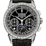 41 mm platinum case, interchangeable full and sapphire-crystal back, bezel and lugs set with 58 baguette diamonds (~3.63 ct), black lacquered dial with gold applied hour markers and 1 baguette diamond at 12 o'clock, caliber CH 29-535 PS Q manually wound movement with central chronograph hand and instantaneous 30-minute counter, perpetual calendar, day, month, leap year and day/night display in apertures, date by hand, seconds subdial, tachymeter scale, moon phases, approximately 65 hours of power reserve, shiny black alligator strap with square scales, fold-over buckle set with 22 baguette diamonds (~0.97 ct). Water resistant to 30 m.