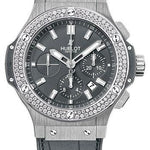 44mm stainless steel case, stainless steel bezel set with 114 diamonds (1.78 ct), black composite resin lateral inserts and bezel lugs, tantulum color dial, self winding HUB 4100 movement with chronograph function, approximately 42 hours of power reserve, grey rubber and gummy alligator strap with deployant buckle. Water resistant to 100 meters.