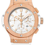 44mm 18K red gold case, white composite resin lateral inserts and bezel lugs, 18K red gold bezel, white dial, self winding HUB 4100 movement with chronograph function, approximately 42 hours of power reserve, white rubber strap with deployant buckle. Water resistant to 100 meters.