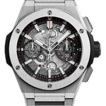 42 mm satin-finished and polished titanium case, satin-finished and polished titanium bezel with 6 H-shaped titanium screws, black composite resin lower bezel, sapphire crystal with anti-reflective treatment, matte black skeleton dial, HUB1280 UNICO manufacture self-winding chronograph flyback movement, approximately 72 hours of power reserve, satin-finished and polished titanium bracelet, titanium deployant buckle. Water resistant to 100m (10 ATM).