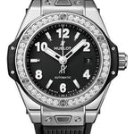 33 mm polished and satin-finished stainless steel case, polished stainless steel bezel set with 36 diamonds for 0.76ct, sapphire crystal with anti-reflective treatment, matte black dial, HUB1120 self-winding movement, approximately 40 hours of power reserve, black structured lined rubber strap, stainless steel deployant buckle. Water resistant to 100m (10 ATM).
