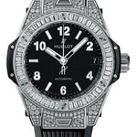 39 mm polished stainless steel case set with 118 diamonds (~0.84ct), polished 18K white gold bezel polished 18k white gold set with 48 baguette-cut diamonds (~1.90cts) and 6 H-shaped titanium screws, sapphire crystal with anti-reflective treatment, mat black dial, HUB1710 self-winding movement, approximately 50 hours of power reserve, black structured lined rubber strap, stainless steel deployant buckle. Water resistant to 100 meters.