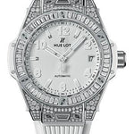 39 mm polished stainless steel case set with 118 diamonds (~0.84ct), polished 18K white gold bezel polished 18k white gold set with 48 baguette-cut diamonds (~1.90cts) and 6 H-shaped titanium screws, sapphire crystal with anti-reflective treatment, mat white dial, HUB1710 self-winding movement, approximately 50 hours of power reserve, white structured lined rubber strap, stainless steel deployant buckle. Water resistant to 100 meters.