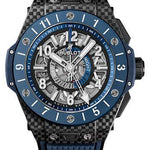 45 mm carbon fiber case, microblasted blue ceramic bezel, sapphire crystal with anti-reflective treatment, blue and matte black skeleton dial, HUB1251 movement, approximately 72 hours of power reserve, black and blue lined structured rubber strap, carbon fiber and black-plated titanium deployant buckle. Water resistant to 100m.