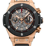 45 mm polished and satin-finished 18K King Gold case, satin-finished black ceramic bezel, anodized black aluminum lower bezel with 6 H-shaped titanium screws, sapphire crystal with anti-reflective treatment and Hublot logo printed on the inner side, mat black and gold plated dial with satin-finished indexes, satin-finished and microblasted gold plated hands, white luminescent on hour markers and hands, HUB1242 UNICO manufacture self-winding chronograph flyback movement with column wheel, approximately 72 hours of power reserve, black rubber and satin-finished 18K King Gold and ceramic bracelet, 18K King Gold deployant buckle. Water resistant to 100 meters.