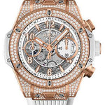 42 mm satin-finished and polished 18k king gold case set with 170 diamonds for ~0.8ct, satin-finished and polished 18K king gold bezel set with 126 diamonds for ~1.1cts, 6 H-shaped titanium screws, sapphire crystal with anti-reflective treatment, matte white skeleton dial, HUB1280 UNICO manufacture self-winding chronograph flyback movement, approximately 72 hours of power reserve, white structured lined rubber strap, 18K king gold and black-plated titanium deployant buckle. Water resistant to 100m (10 ATM).