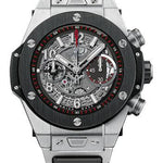 45 mm polished and satin-finished titanium case, satin-finished black ceramic bezel, anodized black aluminum lower bezel with 6 H-shaped titanium screws, sapphire crystal with anti-reflective treatment and Hublot logo printed on the inner side, mat black dial with rhodium-plated upper layer indexes, satin-finished and microblasted rhodium-plated hands, white luminescent on hour markers and hands, HUB1242 UNICO manufacture self-winding chronograph flyback movement with column wheel, approximately 72 hours of power reserve, black rubber and satin-finished titanium and ceramic bracelet, titanium deployant buckle. Water resistant to 100 meters.