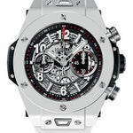 45 mm microblasted and polished white ceramic case, microblasted and polished white ceramic bezel with 6 h-shaped titanium screws, sapphire crystal with anti-reflective treatment, mat black dial with rhodium-plated counterssatin-finished and microblasted rhodium-platedappliques and hands with white luminescent, HUB 1242 self-winding movement with flyback chronograph and column wheel, approximately 72 hours of power reserve, black rubber and microblasted white ceramic bracelet, titanium deployant buckle. Water resistant to 100 m.