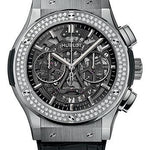 45 mm satin-finished and polished titanium case, polished titanium bezel set with 126 diamonds for 1.47cts with, 6 H-shaped titanium screws, sapphire crystal with anti-reflective treatment, sapphire dial, HUB1155 self-winding skeleton chronograph movement, approximately 42 hours of power reserve, black rubber and alligator strap, stainless steel deployant buckle. Water resistant to 50m (5 ATM).