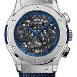 45 mm satin-finished and polished titanium case, sapphire crystal back, blue composite resin bezel end pieces, satin-finished and polished titanium bezel with 6 H-shaped titanium screws, sapphire crystal with anti-reflective treatment, sapphire dial with blue lacquered appliques, HUB 1155 self-winding movement with chronograph, approximately 42 hours of power reserve, blue rubber and blue calf strap with blue stitching, stainless steel deployant buckle. Water resistant to 50 meters.