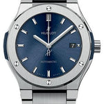 45 mm satin-finished and polished titanium case, satin-finished and polished titanium bezel with 6 H-shaped titanium screws, sapphire crystal with anti-reflective treatment, blue sunray dial, HUB 1112 self-winding movement, approximately 42 hours of power reserve, satin-finished and polished titanium bracelet, titanium deployant buckle. Water resistant to 50 meters.