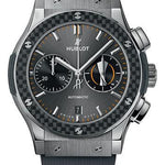 45 mm satin-finished and polished titanium case, polished titanium and carbon fiber bezel with 6 H-shaped titanium screws, sapphire crystal with anti-reflective treatment, satin-finished grey sunray dial with printed UEFA Europa League logo in 3 o'clock counter, HUB1143 self-winding movement with chronograph, approximately 42 hours of power reserve, grey grey lined rubber strap, stainless steel deployant buckle. Water resistant to 50 meters.