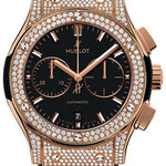 45 mm (available in 42 mm) polished titanium case set with 244 diamonds for 1.30ct, polished 18K king gold bezel set with 126 diamonds for (~1.47 cts), sapphire crystal with anti-reflective treatment, black dial with satin-finished and gold plated appliques and polished gold-plated hands, HUB1143 self-winding movement with chronograph, approximately 42 hours of power reserve, black rubber and alligator strap, 18K red gold and black PVD stainless steel deployant buckle. Water resistant to 50 meters.