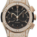 45mm 18K King gold case set with 244 diamonds (1.30ct), sapphire crystal back, 18K King gold bezel set with 126 diamonds (1.60ct), black composite resin lateral inserts and bezel lugs, mat black dial, self winding HUB 1143 movement with chronograph function, approximately 42 hours of power reserve, black rubber and alligator strap with deployant buckle. Water resistant to 50 meters.