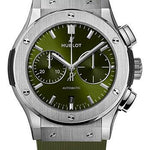 45 mm satin-finished and polished titanium case, satin-finished and polished titanium bezel with 6 h-shaped titanium screws, sapphire crystal with anti-reflective treatment, satin-finished green sunray dial, HUB1143 self-winding chronograph movement, approximately 42 hours of power reserve, green lined rubber strap, stainless steel deployant buckle. Water resistant to 50m (5 ATM).