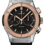 45 mm satin-finished and polished titanium case, vertical satin-finished 18K king gold bezel with 6 h-shaped titanium screws, sapphire crystal with anti-reflective treatment, matte black dial, HUB1143 self-winding chronograph movement, approximately 42 hours of power reserve, black lined rubber strap, 18K king gold and stainless steel deployant buckle. Water resistant to 50m (5 ATM).