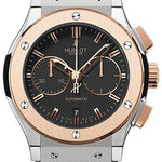 45mm titanium case, sapphire crystal back, 18K King gold bezel, black composite resin lateral inserts and bezel lugs, mat black dial, self winding HUB 1143 movement with chronograph function, approximately 42 hours of power reserve, black rubber and alligator strap with deployant buckle. Water resistant to 50 meters.