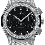 45 mm (available in 42 mm) polished titanium case set with 244 diamonds for 1.30ct, polished titanium bezel set with 126 diamonds for (~1.47 cts), sapphire crystal with anti-reflective treatment, black dial with mat black dial, satin-finished rhodium-plated appliques, and polished rhodium-plated hands, HUB1143 self-winding movement with chronograph, approximately 42 hours of power reserve, black rubber and alligator strap, stainless steel deployant buckle. Water resistant to 50 meters.