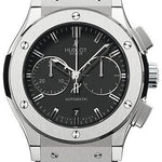 45mm titanium case, sapphire crystal back, titanium bezel, black composite resin lateral inserts and bezel lugs, mat black dial, self winding HUB 1143 movement with chronograph function, approximately 42 hours of power reserve,. Water resistant to 50 meters.
