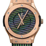 45 mm satin-finished and polished 18k king gold case, satin-finished and polished 18K king gold bezel with 6 H-shaped titanium screws, sapphire crystal with anti-reflective treatment, cruz diez pattern printed on a 2 level dial, HUB1112 self-winding movement, approximately 42 hours of power reserve, black rubber and cruz diez pattern printed on calf leather strap, 18K king gold and black-plated stainless steel deployant buckle. Water resistant to 50m (5 ATM).