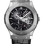 45mm titanium case, titanium bezel vertical satin finish, sapphire dial with silvered Hublot logo transfer, hand-wound skeleton HUB 1300 movement with small seconds at 7 o'clock, approximately 90 hours of power reserve, black alligator and rubber strap with deployant buckle. Water resistant to 50 meters.