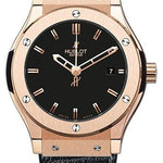 45mm 18K King red gold case, sapphire crystal back, 18K red gold bezel, black composite resin lateral inserts and bezel lugs, mat black dial, self winding HUB 1112 movement, approximately 42 hours of power reserve, black rubber and alligator strap with deployant buckle. Water resistant to 50 meters.