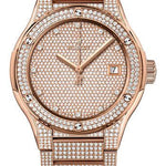 45 mm polished 18k king gold case set with 100 diamonds, polished 18K king gold bezel set with 126 diamonds with, 6 H-shaped titanium screws, sapphire crystal with anti-reflective treatment, dial set with 636 diamonds, HUB1112 self-winding movement, approximately 42 hours of power reserve, polished 18K king gold bracelet, 18K king gold deployant buckle. Water resistant to 50m (5 ATM).