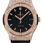 45 mm polished titanium case set with 218 diamonds for 1.41cts, polished 18K king gold bezel set with 126 diamonds for 1.41cts, sapphire crystal with anti-reflective treatment, mat black dial, HUB1112 self-winding movement, approximately 42 hours of power reserve, black rubber and alligator strap, 18K king gold and black pvd stainless steel deployant buckle. Water resistant to 50m (5 ATM).