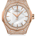 40 mm polished 18k king gold case set with 210 diamonds totaling ~1.0ct, polished 18K king gold bezel set with 54 diamonds totaling ~0.6ct, 6 H-shaped titanium screws, sapphire crystal with anti-reflective treatment, polished faceted white dial, HUB1110 self-winding movement, approximately 42 hours of power reserve, white smooth rubber strap, 18K gold 5N and stainless steel deployant buckle. Water resistant to 50m (5 ATM).