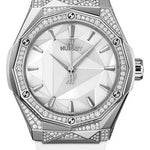 40 mm polished titanium case set with 112 diamonds totaling ~0.5ct, polished titanium bezel set with 54 diamonds totaling ~0.6ct, 6 H-shaped titanium screws, sapphire crystal with anti-reflective treatment, polished faceted white dial, HUB1100 self-winding movement, approximately 42 hours of power reserve, white smooth rubber strap, stainless steel deployant buckle. Water resistant to 50m (5 ATM).
