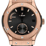 45 mm polished and satin-finished 18K King Gold case, vertical satin-finished 18K King Gold bezel with 6 H-shaped titanium screws, sapphire crystal with anti-reflective treatment, black dial with polished Gold-plated appliques and hands, HUB1601 manual movement with reserve movement, approximately 192 hours / 8 days of power reserve, black rubber and alligator strap, 18K red gold and black PVD stainless steel deployant buckle. Water resistant to 50 meters.