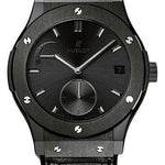 45 mm polished and satin-finished black ceramic case, polished and satin-finished black ceramic bezel with 6 H-shaped titanium screws, sapphire crystal with anti-reflective treatment, black dial with sunray satin-finish and polished black plated appliques and hands, HUB1601 manual movement with reserve movement, approximately 192 hours / 8 days of power reserve, black rubber and alligator strap, black PVD stainless steel deployant buckle. Water resistant to 50 meters.