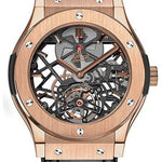 45mm 18K King Gold case, sapphire crystal back, 18K King gold bezel, black composite resin lateral inserts and bezel lugs, sapphire dial, manual winding MHUB 6010.H1.8 movement with skeleton tourbillon, approximately 120 hours of power reserve, black rubber and alligator strap with deployant buckle. Water resistant to 50 meters.