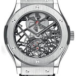 45mm titanium case, sapphire crystal back, titanium bezel, black composite resin lateral inserts and bezel lugs, sapphire dial, manual winding MHUB 6010.H1.1 movement with skeleton tourbillon, approximately 120 hours of power reserve, black rubber and alligator strap with deployant buckle. Water resistant to 50 meters.