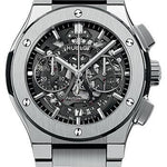 45 mm polished and satin-finished titanium case, polished and satin-finished titanium bezel, sapphire crystal with anti-reflective treatment, sapphire dial, HUB 1155 self-winding skeleton chronograph movement, approximately 42 hours of power reserve, satin-finished and polished titanium bracelet, titanium deployant buckle. Water resistant to 50 m.