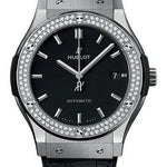 45 mm polished and satin-finished titanium case, polished titanium bezel set with 126 diamonds for 1.41cts, sapphire crystal with anti-reflective treatment, mat black dial, HUB1112 self-winding movement, approximately 42 hours of power reserve, black rubber and alligator strap, stainless steel deployant buckle. Water resistant to 50m (5 ATM).