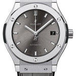 45 mm polished and satin-finished titanium case, polished and satin-finished titanium bezel, sapphire crystal with anti-reflective treatment, grey sunray satin-finished dial, HUB 1112 self-winding movement, approximately 42 hours of power reserve, black and grey rubber and alligator strap, stainless steel deployant buckle. Water resistant to 50 m.