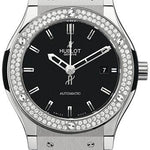 45mm titanium case, sapphire crystal back, titanium bezel set with 126 diamonds (1.60ct), black composite resin lateral inserts and bezel lugs, mat black dial, self winding HUB 1112 movement, approximately 42 hours of power reserve, black rubber and alligator strap with deployant buckle. Water resistant to 50 meters.