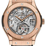 45 mm polished and satin-finished 18K King Gold case, vertical satin-finished 18K King Gold bezel set with 6 H-shaped titanium screws, sapphire crystal with anti-reflective treatment, sapphire dial with polished Gold-plated appliques and hands, HUB8001 manual movement with minute repeater Tourbillon, approximately 85 hours of power reserve, black rubber and alligator strap, 18K red gold and black PVD stainless steel deployant buckle. Water resistant to 300 meters.