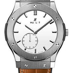 45 mm (available in 42 mm) polished and satin finished titanium case, vertical satin-finished titanium bezel with 6 H-shaped titanium screws, sapphire crystal with anti-reflective treatment, white dial with polished rhodium-plated appliques and hands, HUB1301.4 manual movement with small second at 7.00, approximately 90 hours of power reserve, black rubber and alligator has ecru stitching strap, stainless steel deployant buckle. Water resistant to 50 meters.